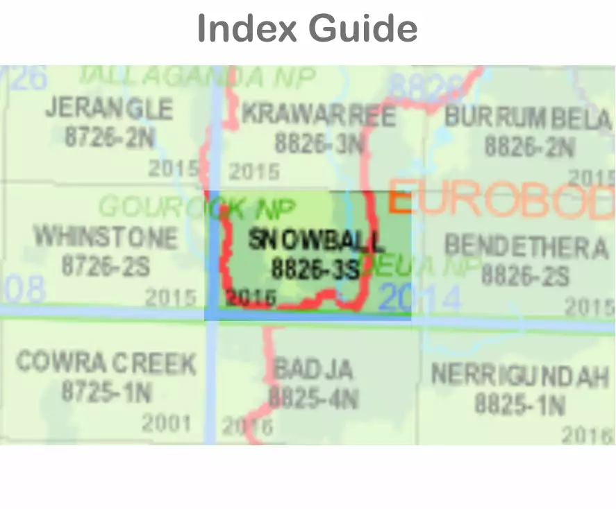 The Snowball 8826-3-S 1:25,000 scale New South Wales topographic map shows contours, streams, roads, tracks, buildings, place names, points of interest, vegetation, selected administrative boundaries and much more.