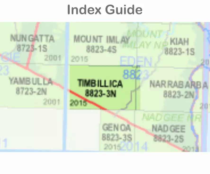 The Timbillica 8823-3-N 1:25,000 scale New South Wales topographic map shows contours, streams, roads, tracks, buildings, place names, points of interest, vegetation, selected administrative boundaries and much more.