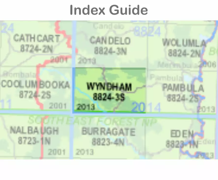 The Wyndham 8824-3-S 1:25,000 scale New South Wales topographic map shows contours, streams, roads, tracks, buildings, place names, points of interest, vegetation, selected administrative boundaries and much more.