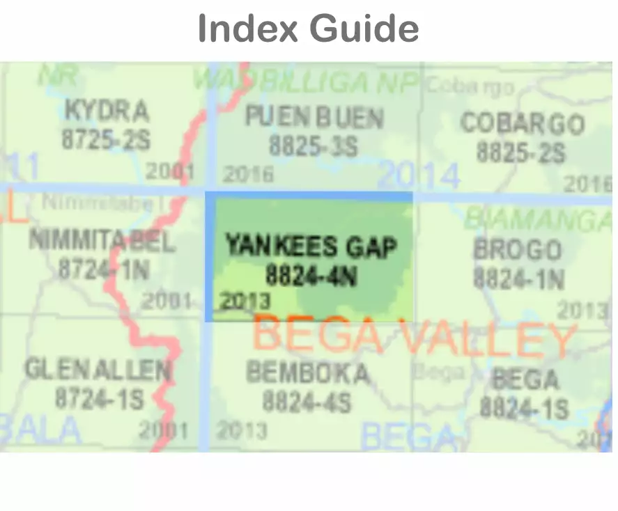 The Yankees Gap 8824-4-N 1:25,000 scale New South Wales topographic map shows contours, streams, roads, tracks, buildings, place names, points of interest, vegetation, selected administrative boundaries and much more.