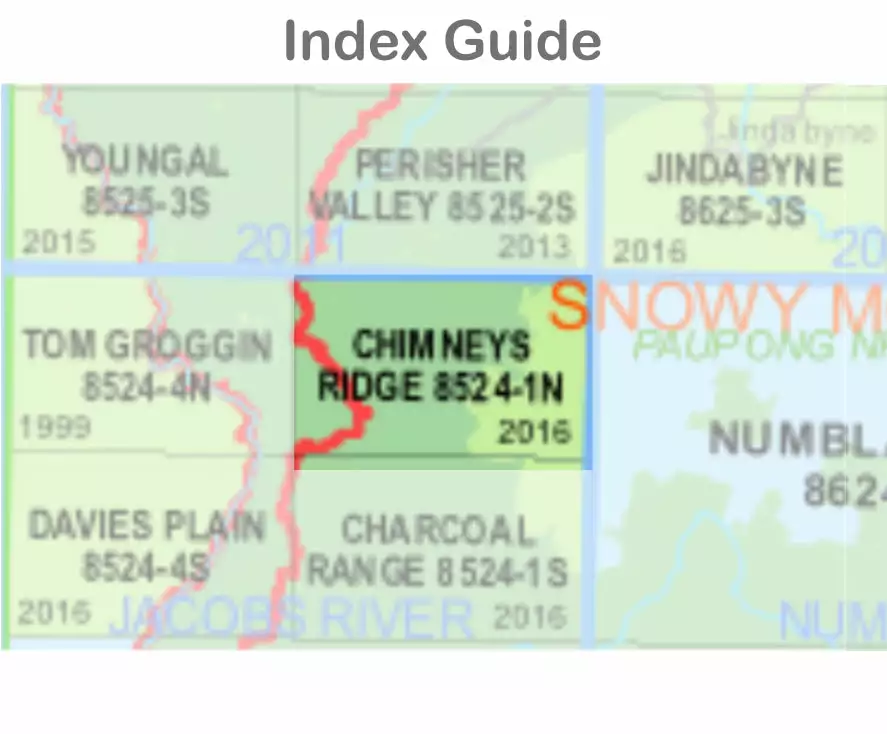 The Chimneys Ridge 8524-1-N 1:25,000 scale New South Wales topographic map shows contours, streams, roads, tracks, buildings, place names, points of interest, vegetation, selected administrative boundaries and much more.