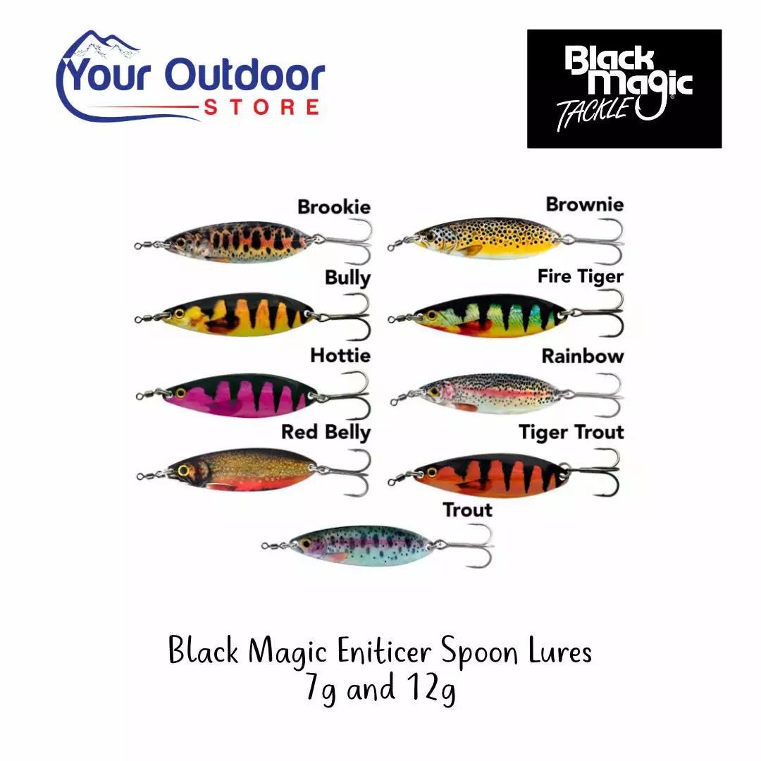 The continued expansion of Black Magic’s freshwater range has seen the introduction of the Enticer range of spinners. These new lures feature startlingly lifelike finishes which imitate a number of juvenile fish species. When coupled with their fluttering action, they are particularly attractive to predatory fish. There are nine colour options to choose from in either a 7g or 12g weight. The lures are manufactured from high quality components including chemically sharpened treble hooks, strong split rings and a swivel to help prevent line twist. Enticers are very effective for both trolling and casting from the shoreline for a number of species, including trout and salmon.