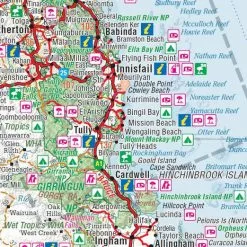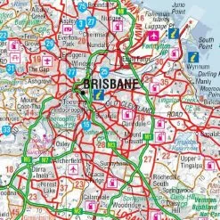 A touring map of Queensland for travelling throughout the state that has camping and rest areas, 24-hour fuel and points of interest marked on the mapping.