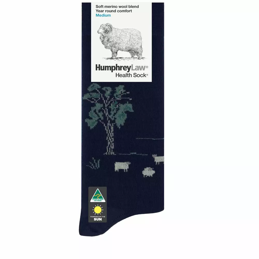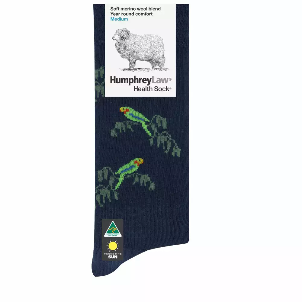 This fine merino wool dress sock with a tourist motif is a great Australian souvenir. Excellent for business wear, it keeps feet warm and comfortable, but is fine enough to fit comfortably in most shoes. Extra nylon reinforcing gives longer wear. A Health Sock® with no tight elastic top.