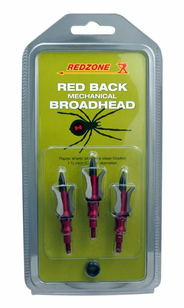 Redzone Red Back 3-blade 100 grain weight mechanical broadheads with built in front cutting mini blade offers optimum performance in the field. Their razor sharp stainless steel expanding head blades expand instantly upon contact and offer up to a 1-1/2″ cutting diameter.